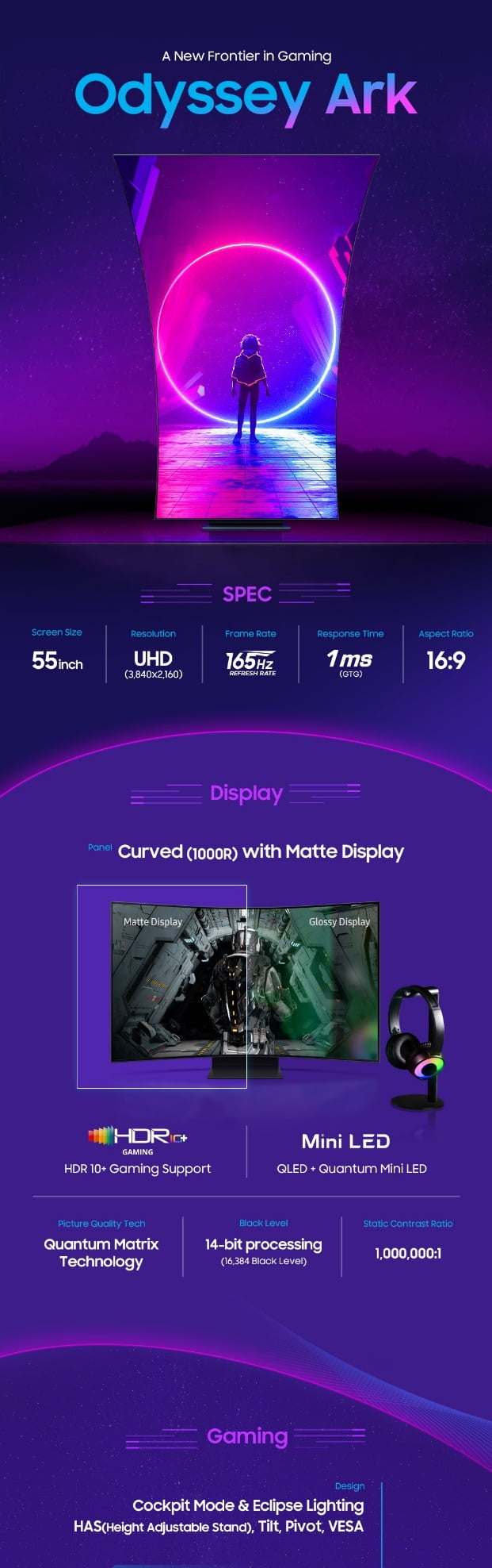 Samsung Odyssey Ark represents a bold new direction for gaming screens. Take a look at its key features in the infographic below.