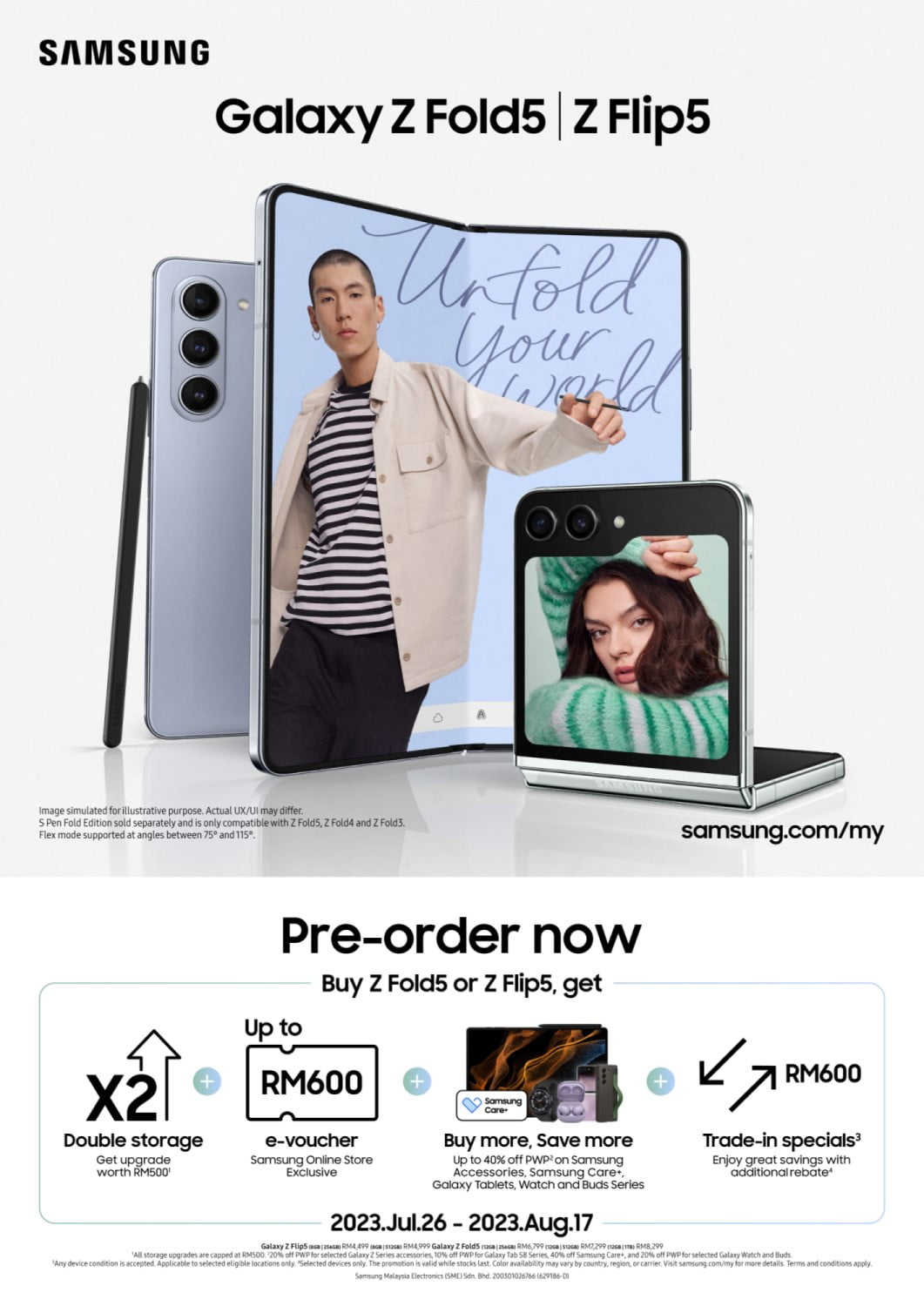 We know you can’t wait to own the latest Galaxy innovations, so get ready to pre-order them all from 26 July – 17 August 2023. Get your hands on the Galaxy Z Fold5 from RM6,799, Galaxy Z Flip5 from RM4,499, Galaxy Watch6 Classic from RM1,399, Galaxy Watch6 from RM1,099, Galaxy Tab S9 Ultra from RM6,499, Galaxy Tab S9 Plus from RM5,199, and Galaxy Tab S9 from RM4,199.