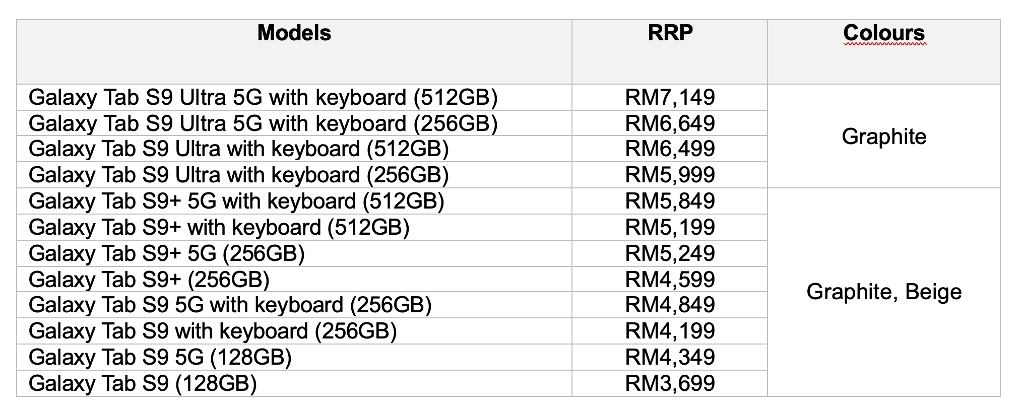 Get the Galaxy Tab S9 Ultra (512GB) with keyboard RRP RM6,499 at the price of a Galaxy Tab S9 Ultra (256GB) with keyboard RM5,999. Get the Galaxy Tab S9+ (512GB) RRP RM5,199 at the price of a Galaxy Tab S9+ (256GB) RRP RM4,599. Get the Galaxy Tab S9 (256GB) RRP RM4,199 at the price of Galaxy Tab S9 (128GB) RM3,699.