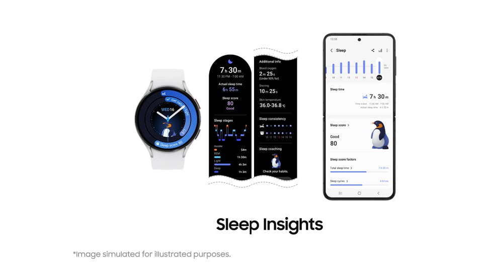 Furthermore, maintaining a sleep-friendly environment is important for a restful night of sleep. When it’s time for bed, your Galaxy Watch can help set the optimal sleep environment by automatically adjusting the settings of connected home devices. In addition, when Sleep Mode is turned on, the invisible LED infrared sensor on the watch activates to minimize even the smallest of distractions.